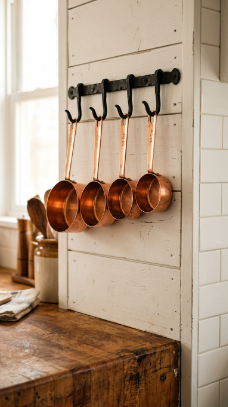 A set of copper measuring cups with long handles hanging from a small rack or displayed on a shelf is the farmhouse kitchen’s most beautiful and functional decorative accent.