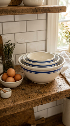 A set of three nesting ceramic mixing bowls in white with a simple blue stripe or speckled finish is classic farmhouse kitchen utility made beautiful.