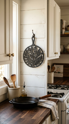 A set of decorative black iron trivets in farmhouse silhouettes — barn, leaf, or geometric — displayed on the counter or wall adds character between uses.
