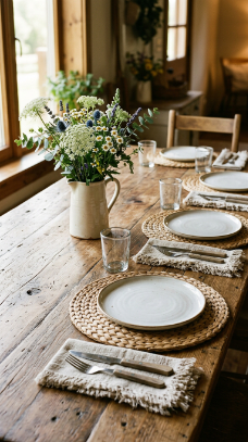 A set of four natural woven seagrass or rattan placemats on a farmhouse dining table adds beautiful organic texture to every meal from breakfast to dinner party.
