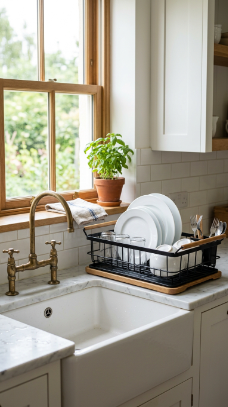 A wooden and stainless or black iron dish drying rack beside the farmhouse sink is a beautiful practical piece that makes even the washing up look considered.
