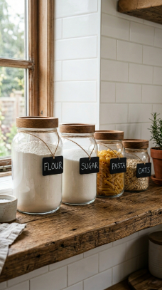 A set of large glass storage jars with wooden or cork lids for flour, sugar, pasta and grains on the counter or open shelving is farmhouse kitchen organization made beautiful.