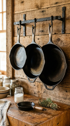 A set of three cast iron skillets in graduated sizes hanging on a black iron wall rack or stored nested on open shelving is the farmhouse kitchen’s most honest and beautiful cookware display.