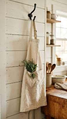 A natural linen cross-back or half apron in cream or striped fabric hanging from a black iron hook is a farmhouse kitchen styling detail as beautiful as it is practical.