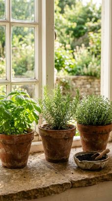 A set of three small terracotta pots with fresh culinary herbs lined on the kitchen windowsill or counter is the farmhouse kitchen’s most alive and fragrant accessory.
