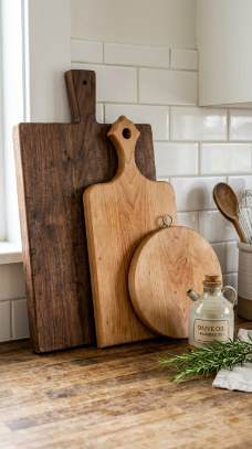 A collection of wooden cutting boards in varying shapes and sizes — round, rectangular, with handles — displayed on the counter or wall when not in use is farmhouse kitchen art.