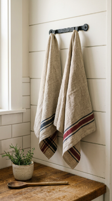 A set of four natural linen kitchen towels in classic stripes or simple embroidered patterns hanging from the oven handle or a hook is the farmhouse kitchen textile essential.