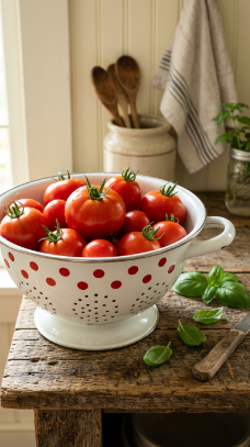 A large white enamel colander with red or blue dot pattern is a farmhouse kitchen classic that looks beautiful displayed on the counter or hanging from a pot rack.