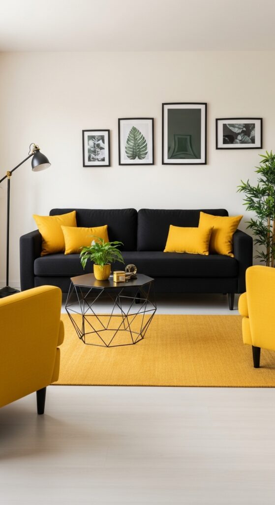 Vibe sentence: Black and mustard yellow is the living room equivalent of a perfectly tailored suit with a pocket square — graphic, confident, and completely put together.