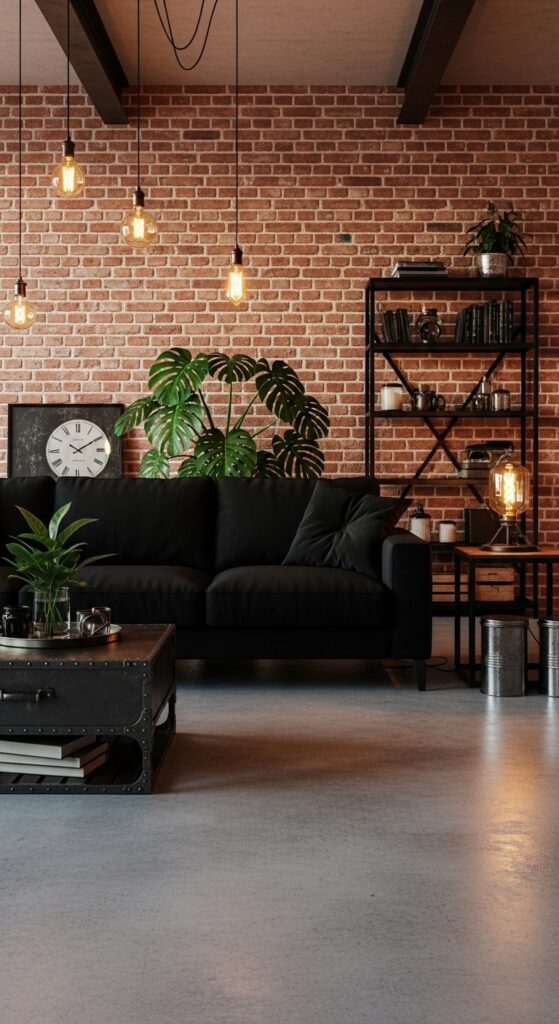 What makes it work: The warmth of red or warm-toned brick against a black sofa creates a naturally beautiful material contrast — rough and smooth, warm and dark, ancient and contemporary. The brick’s irregular surface texture is amplified by the Edison bulb warmth, creating a living, textured backdrop that no painted wall can replicate.