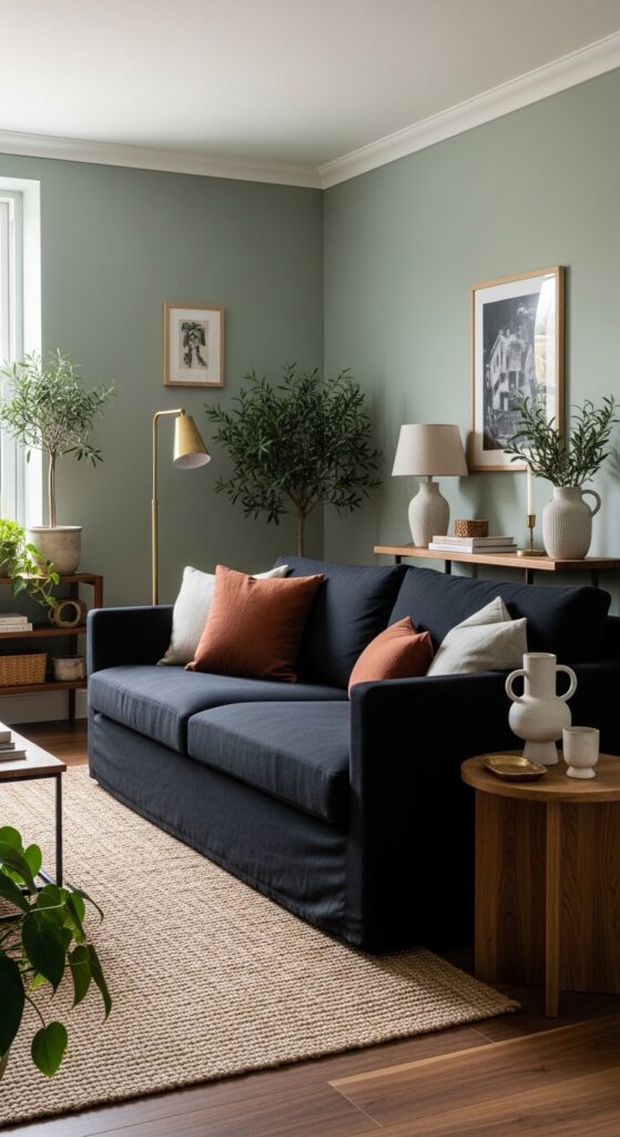 What makes it work: Sage green and black share an organic quality — both are deeply rooted in nature’s palette — which is why they feel genuinely harmonious rather than merely contrasting. Sage green walls push the black sofa forward visually while simultaneously warming it, preventing the dark upholstery from appearing to recede into shadow.