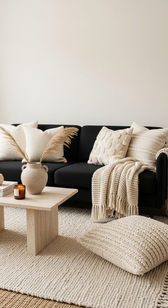 Black Sofa With Layered Neutral Textures