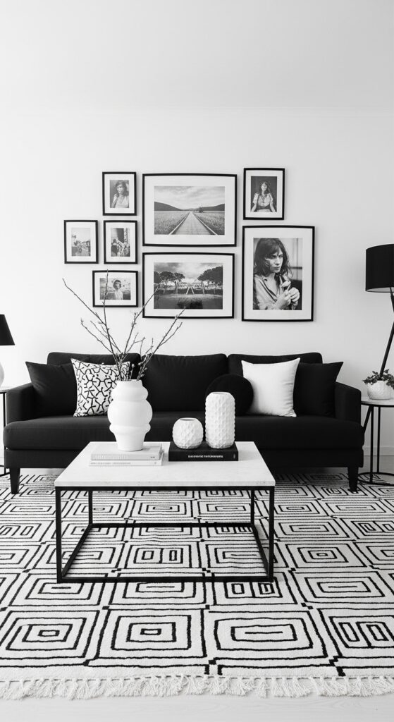Vibe sentence: A fully committed black-and-white living room is the interior design equivalent of a perfect photograph — graphic, timeless, and deeply resolved.