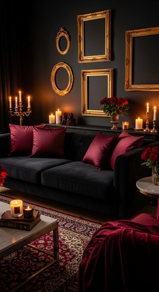 What makes it work: Burgundy and black share a similar depth of tone — both absorb light generously — which means the combination creates a layered darkness rather than a stark contrast. Gold accents act as the essential counterpoint, introducing reflective warmth that prevents the deep palette from feeling heavy or oppressive. This is the classic Renaissance interior palette translated into a contemporary living room.
