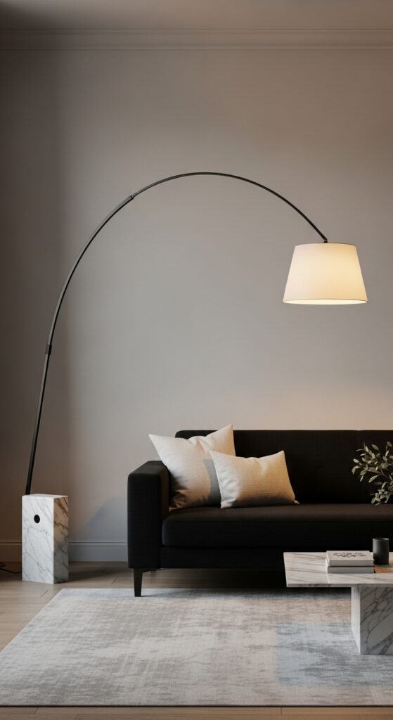 What makes it work: An oversized arc floor lamp creates a defined overhead boundary for the sofa seating zone, functioning like a partial ceiling that makes the seating feel more intimate and purposeful within a larger living room. The visual tension of the sweeping steel arm above the dark sofa — curved against angular, light against dark, marble against fabric — is genuinely sculptural.
