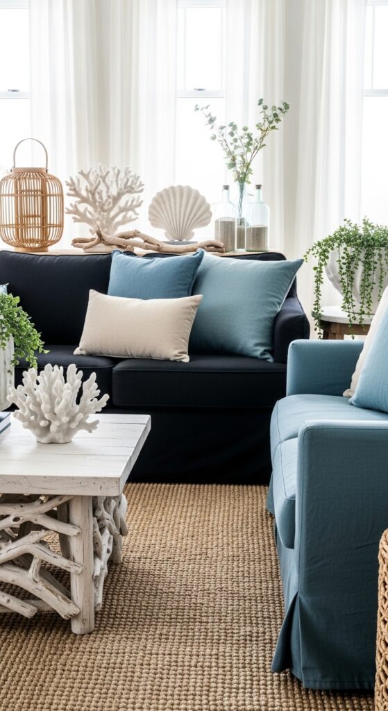 How to achieve it: Keep the black sofa’s cushions in soft ocean blue and natural linen only — avoid bright white cushions, which will compete with the intentional contrast between the sofa and the rest of the room. Bleached driftwood, rattan, and sea glass accents reinforce the coastal material story without undermining the bold dark anchor of the sofa.
