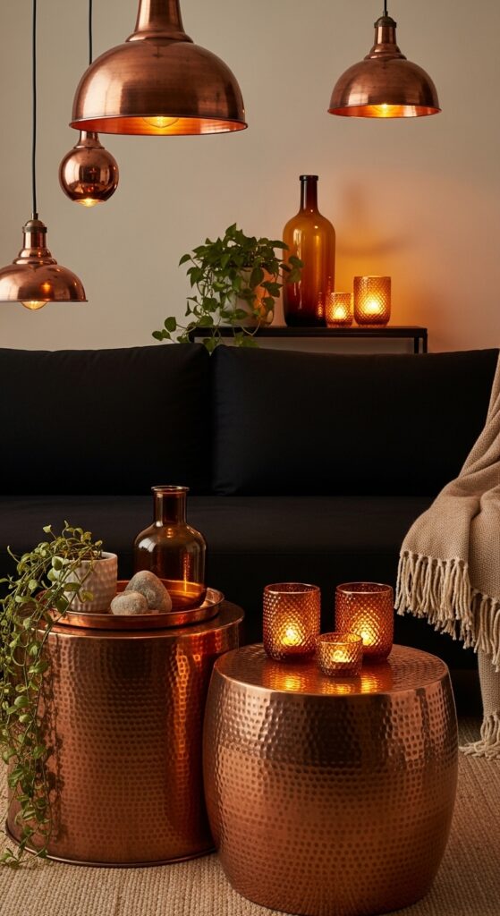 What makes it work: Copper and black create a light-and-dark dynamic that is deeply warm rather than cool — copper’s reddish warmth sits at the opposite end of the metallic spectrum from chrome or silver, and against matte black its warmth is amplified dramatically. The hammered texture of artisan copper objects catches and scatters light in multiple directions, creating a room that feels genuinely alive in the evening.