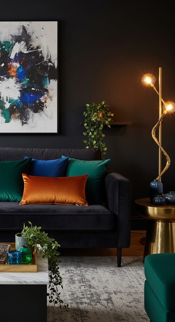 Black Velvet Sofa With Jewel-Tone Cushion Layering