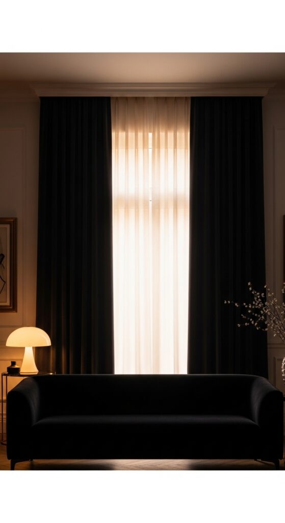 What makes it work: Dark, heavy curtains hung from ceiling height create a vertical architectural backdrop that amplifies the drama of the black sofa in front. The relationship between the sofa and the curtains is one of tone-on-tone depth — slightly different textures and shades of dark that create a richly layered dark background, making anything placed in front of it — a white lamp, a gold frame, a vase — read with exceptional crispness.