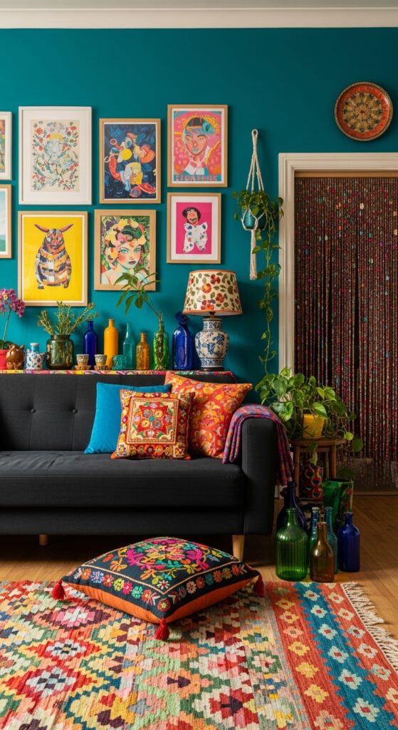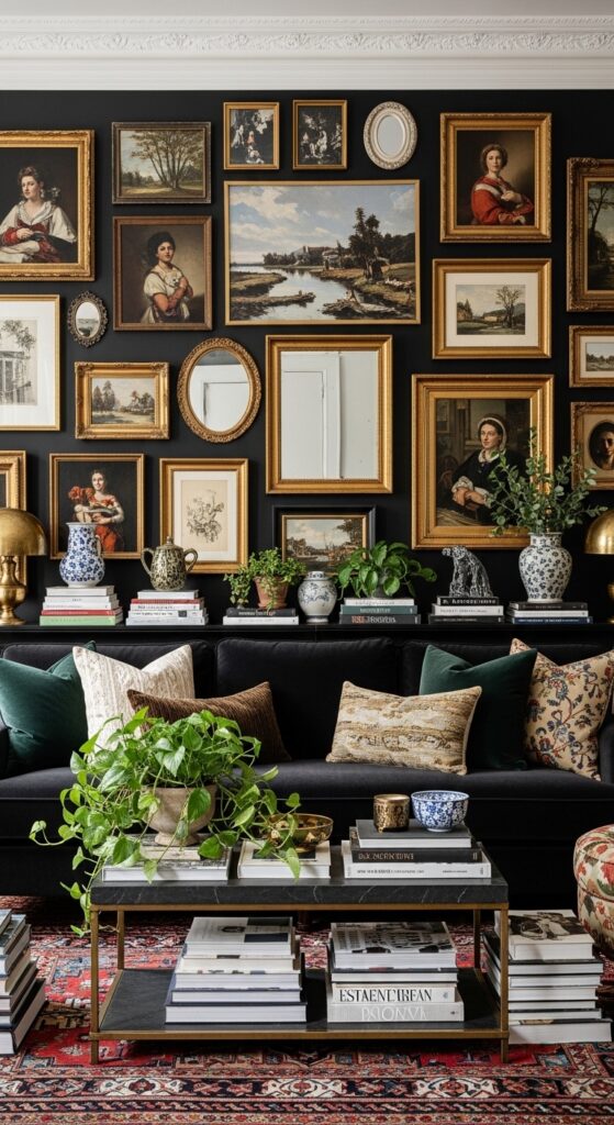 What makes it work: In a maximalist room, the black sofa functions as a visual anchor — the one element consistent enough in its simplicity and darkness to prevent the richness of the surrounding decor from tipping into chaos. The gallery wall works behind the sofa because the sofa’s dark horizontal mass provides a grounding baseline from which the art can ascend vertically.