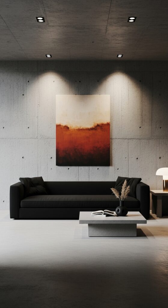 How to achieve it: The quality of the sofa design matters more in a concrete-and-black interior than in any other context — choose a silhouette with strong, clear lines and quality fabric. A single piece of oversized art (minimum 40×50 inches) in warm tones (ochre, rust, cream) introduces necessary warmth without compromising the architectural severity.