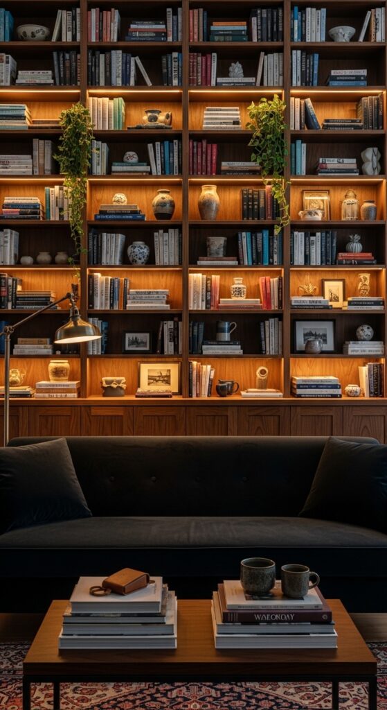 How to achieve it: Organize books loosely by color family rather than strict gradient — aim for color zones of five to seven books each, then intersperse ceramic objects, small framed prints, and trailing plants at regular intervals. Under-shelf LED strip lighting (warm 2700K) installed in each shelf bay illuminates the books beautifully and makes the wall glow.