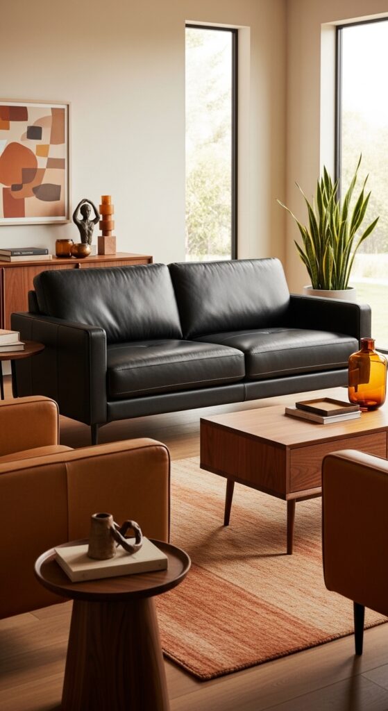 What makes it work: The pairing of black leather with warm caramel leather and walnut wood works on the principle of tonal family — all three materials share warm brown undertones, which means the black reads as part of the same warm palette rather than a contrasting interloper. The slight sheen of full-grain leather catches the warm afternoon light, preventing the sofa from ever feeling heavy or absorbing.