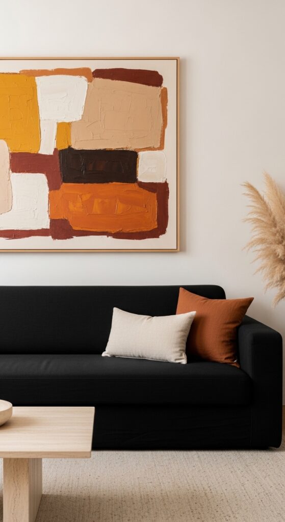 What makes it work: Centering a black sofa against a warm white wall creates the highest possible contrast backdrop for artwork — the dark sofa and light wall together form a two-tone composition that makes the art above read with extraordinary clarity and presence. The key design rule here is scale: the artwork should be at minimum as wide as the sofa’s seat cushions, and ideally as wide as the full sofa back.