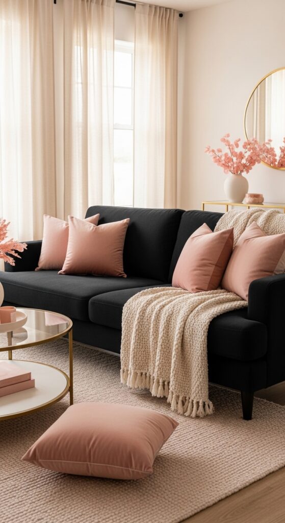 How to achieve it: Style a minimum of three blush elements against the black sofa — cushions, rug, and a throw or vase — to make the color choice feel deliberate rather than accidental. Choose blush tones with warm peachy undertones rather than cool lilac-leaning pinks, which can look cold against black upholstery.