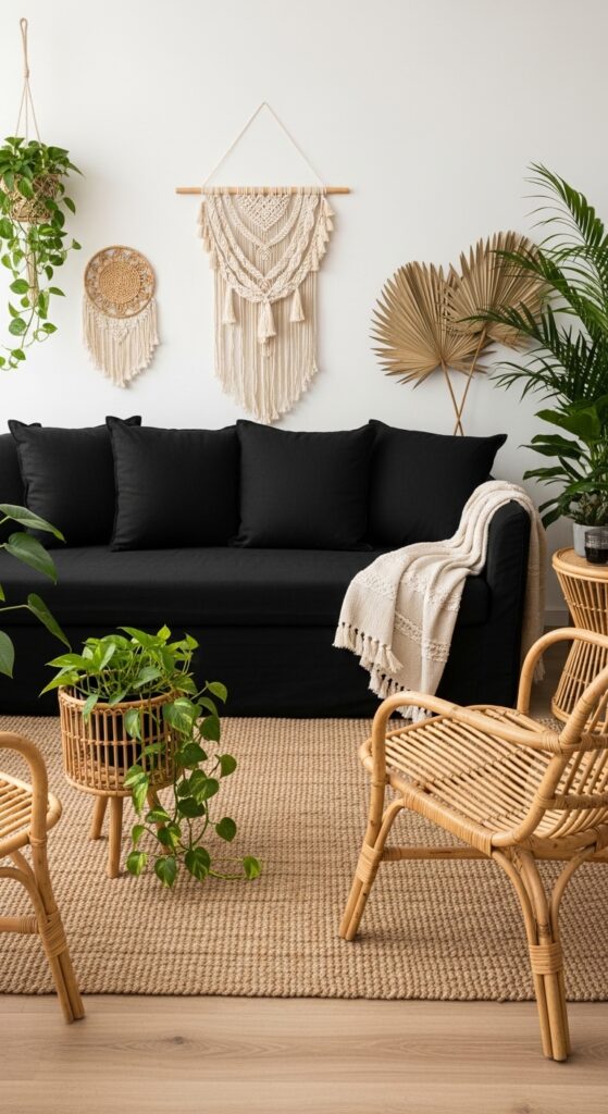 How to achieve it: Pair a black linen or cotton canvas sofa with rattan or cane accent chairs in natural (un-painted) finish. Layer a jute or sisal rug as the floor anchor and bring in at minimum three plant varieties at different heights — trailing, mid-level, and tall — to complete the organic, living quality of the space.