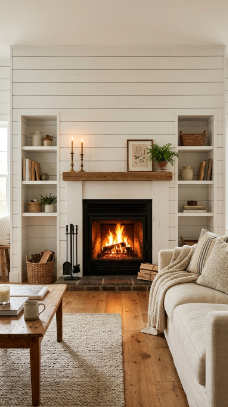 White shiplap wrapping the entire fireplace wall creates the most classic farmhouse focal point.