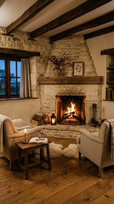 IMAGE PROMPT: Farmhouse living room with deep traditional inglenook fireplace recess with built-in timber bench seating with cushions on either side of the hearth, rustic heritage farmhouse interior style, warm amber firelight as primary atmospheric light, wide eye-level shot into inglenook recess, inglenook in rough-cut stone with heavy timber bressummer beam above firebox opening, bench seats with thick wool cushions in deep red plaid, fire roaring in open hearth, color palette of warm grey stone inglenook, deep honey timber bressummer, deep red plaid cushions, bright amber fire, and deep inglenook shadow, dried herbs hanging from timber beam, iron pot hook in firebox, small iron lantern on bench seat beside cushion, ultra-detailed, photorealistic, high-resolution, Pinterest vertical 2:3 ratio, no people