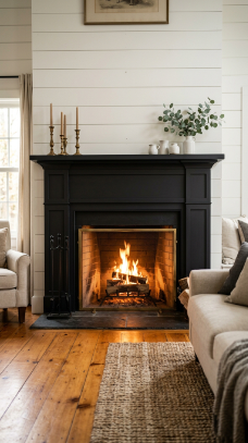 A matte black painted fireplace surround makes a bold, dramatic, and deeply stylish farmhouse statement.