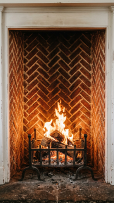 A herringbone-pattern brick interior inside the firebox adds a hidden detail of pure farmhouse elegance.