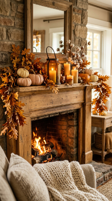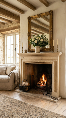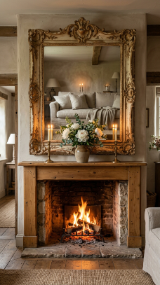 A large vintage or antique mirror above the mantel doubles the firelight and transforms the room.