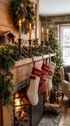 A holiday advent mantel with greenery, candles, and stockings makes December feel truly magical.