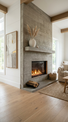 Smooth raw concrete gives the farmhouse fireplace a refined, modern, minimalist edge.