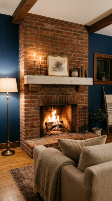 15. The Brick Fireplace With Navy Accents