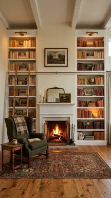 A fireplace flanked by deep recessed bookshelves filled to the brim creates a dream cozy library wall.