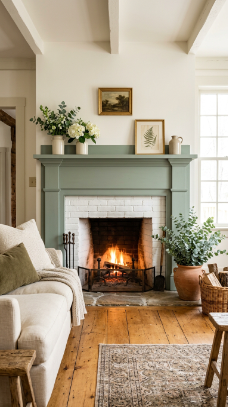 A single painted mantel in sage green, dusty blue, or soft terracotta brings joyful farmhouse personality.