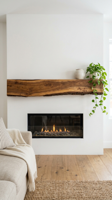A single floating slab of live-edge timber as a mantel is effortlessly modern and deeply farmhouse.