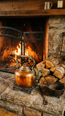 A gleaming copper kettle on the hearth beside crackling logs is the most nostalgic farmhouse detail.