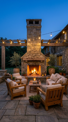 A grand outdoor stone fireplace transforms a farmhouse patio into a year-round living room.