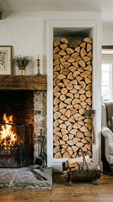 A beautifully stacked built-in log store beside the fireplace is functional farmhouse art.