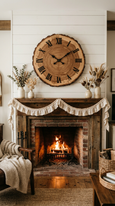 A large natural wood slice clock as the mantle centerpiece brings organic warmth and function together beautifully.
