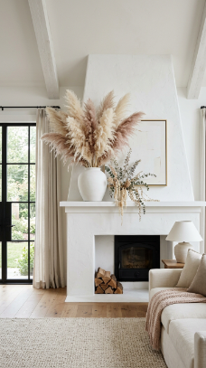 A voluminous dried pampas grass arrangement in a tall ceramic vase on the mantle makes a stunning soft statement.