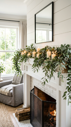 A lush draping garland of fresh eucalyptus along the mantle edge fills the room with beauty and fragrance.