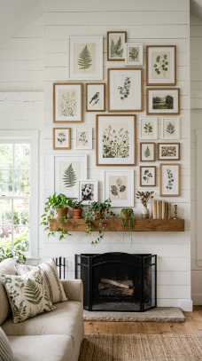 Layering framed botanical prints of varying sizes against the chimney breast creates an artful, collected look.