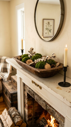 A large antique dough bowl filled with moss balls and dried stems on the mantle is organically beautiful.