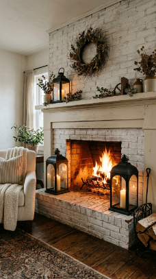 A whitewashed brick fireplace surround with oversized lanterns on the hearth is warmly dramatic farmhouse style.